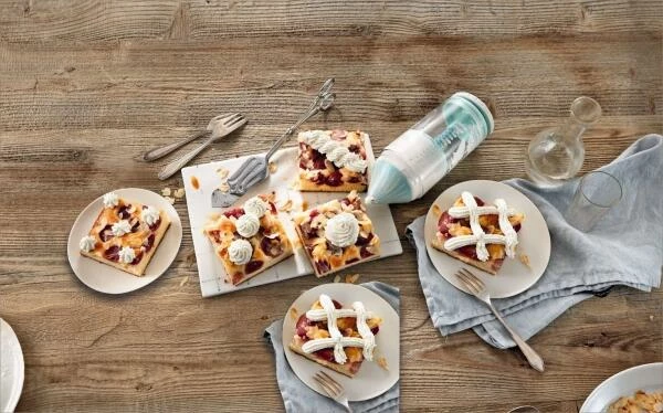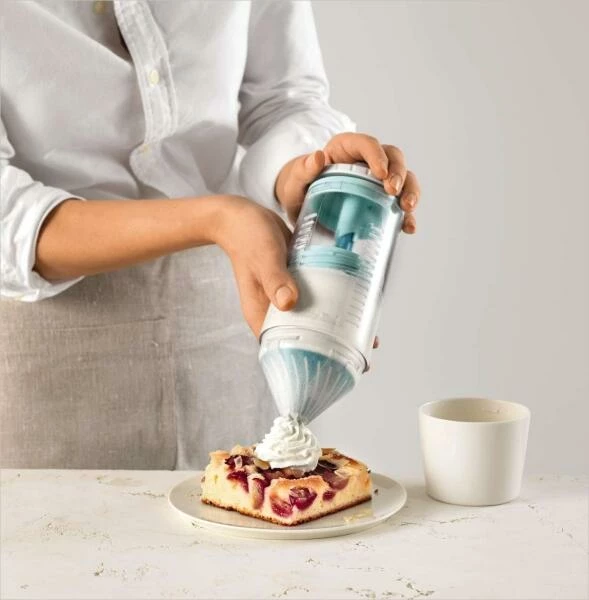 Sahnespender Deco Cream Whipper. Mit diesem Gerät schlagen Sie 2 Fliegen mit einer Klappe: Sahne im Nu herstellen und direkt damit verzieren. Für bis zu 200 ml Sahne geeignet.