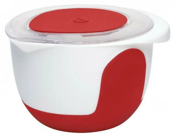 - Integrierter Teigschaber: Der rote Mittelteil des Deckels ist extrem flexibel, so dass er nicht nur die Schüssel perfekt abschließt, sondern auch als Teigschaber dient.