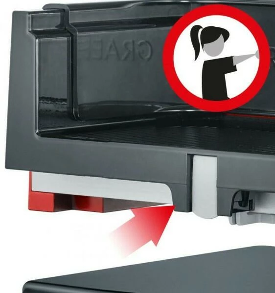 - Stabiler und leichtgängiger Kunststoffschlitten mit Kindersicherung