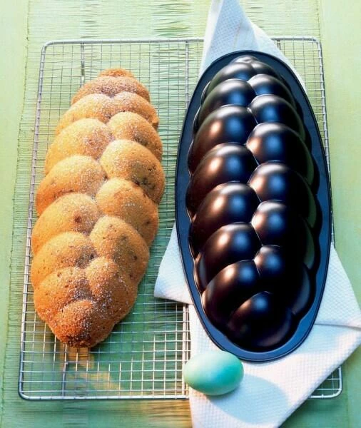 Backform Hefekranz. In der antihaftbeschichteten Backform wird ein traditioneller Hefezopf gebacken.