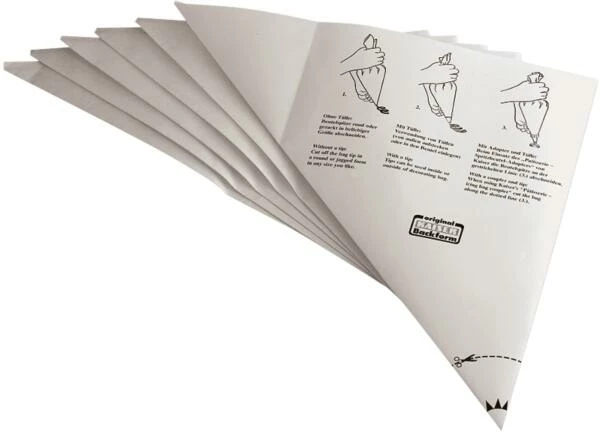 Für die Einweg – Spritzbeutel wurde kunststoffbeschichtetes Spezialpapier verwendet, das die Beutel besonders reißfest macht. An der Außenseite befindet sich eine praktische Anleitung und eine aufgedruckte Schnittkante, die Ihnen zeigt, wo sie den Beutel für optimales Dosieren aufschneiden müssen.
