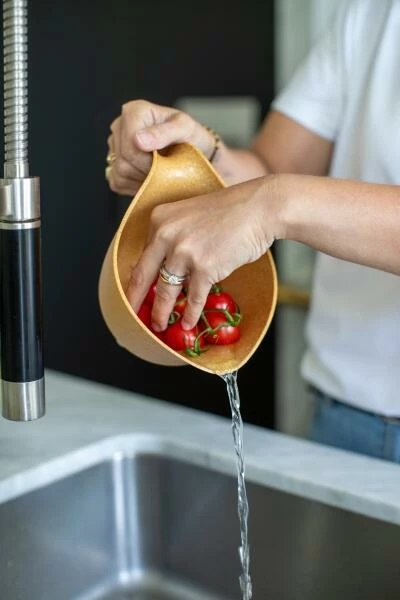 Bei der Reihe “organic bio-circular” von koziol treffen entsorgtes Sonnenblumen- und Rapsöl aus Industrie und Gastronomie recycelt auf Holzfasern, die bei der Forstpflege und der Papierherstellung als Reste anfallen. Alle Hölzer stammen aus FSC®-zertifiziertem Anbau in Europa.