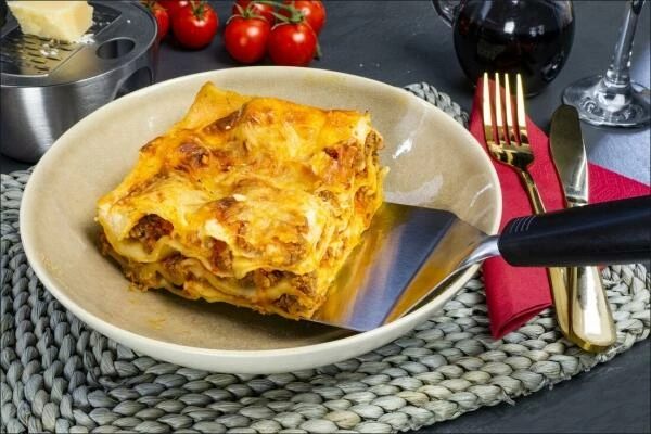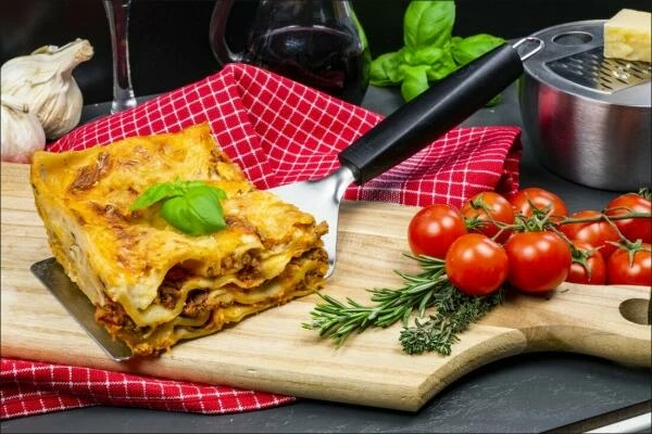 Die vordere Kante der Winkelpalette ist leicht spitz zulaufend. Sie können sie hervorragend als Schneidkante bzw. Trennkante nutzen. So können Sie erst eine duftende Lasagne durchtrennen und im Anschluss aus der Auflaufform heben.