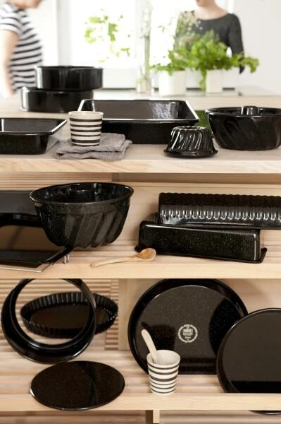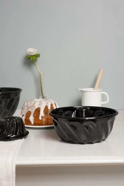 Riess Gugelhupfform aus Emaille in schwarz. Die Backform mit Bördelrand ist in 3 Größen erhältlich. Schwarzemaille ist besonders langlebig und mit porenloser Oberfläche besonders glatt.