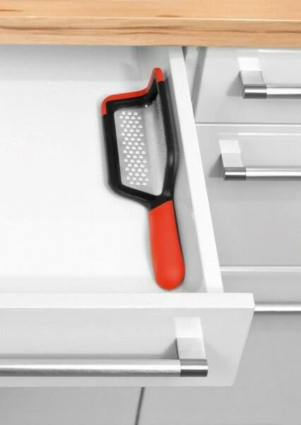 Die Formgebung vereinfacht übrigens nicht nur das Reiben, sondern auch das Aufräumen: Die 2in1 Reibe passt nach der Reinigung in der Spülmaschine in jede Schubladenecke.
