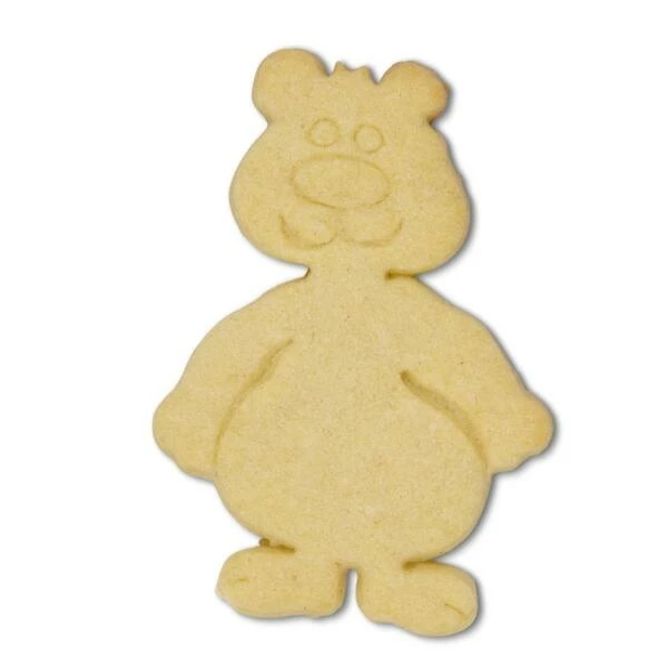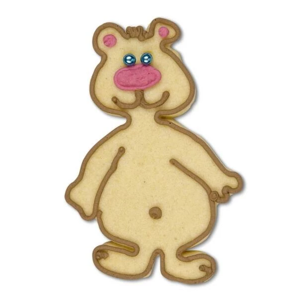 Unser Bär hat gute Laune! Der Ausstecher verpasst Meister Petz nämlich gleich ein fröhliches Bärengesicht mit einer besonders großen Bärennase.