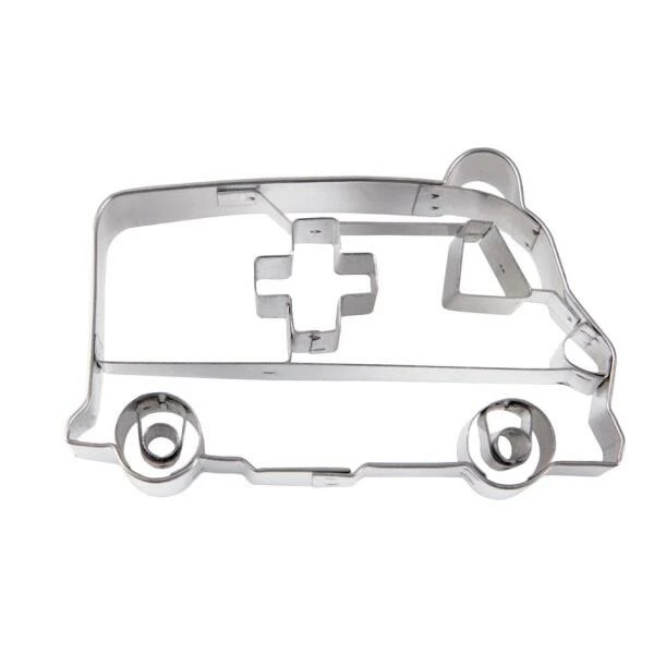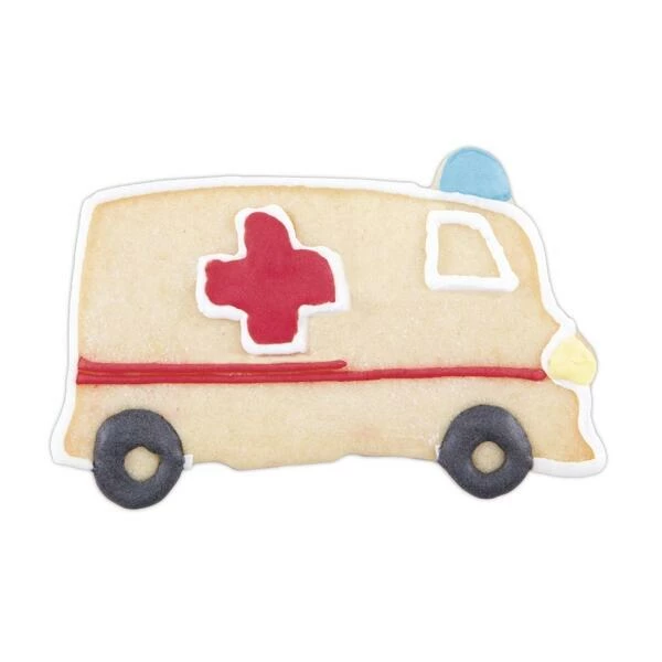 Backen, bis der Arzt kommt! Der Krankenwagen lässt sich dank Prägeform gleich mit rotem Kreuz, Blaulicht und Fenster ausstechen.
