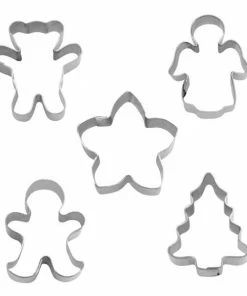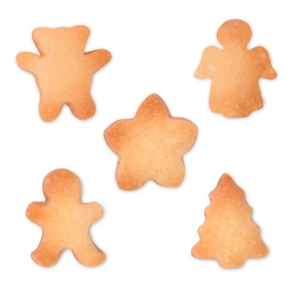 In Sichtverpackung zum Aufhängen. Ausstecher im Set: Engel, Tannenbaum, Lebkuchenmann, Blüte, Bär