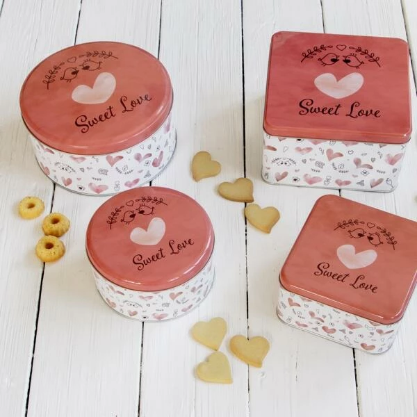 Die Gebäckdose aus der Design-Reihe „Sweet Love“ ist aus Weißblech gefertigt. Sie eignet sich zum Aufbewahren kleiner Kuchen oder Plätzchen, und zum Verschenken kleiner Aufmerksamkeiten.
