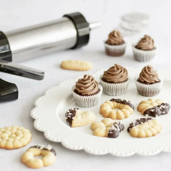 Mit diesem Multitalent bleiben keine Wünsche offen. Ganz einfach und schnell zaubern sie leckeres Spritzgebäck in bis zu 13 verschiedenen Motiven. Zudem können sie mit den 8 Garniertüllen Cupcakes und Torten mit Icing, Frosting oder Buttercreme verzieren.