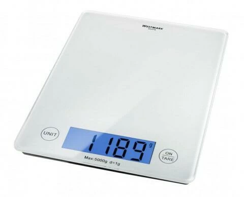 Westmark-Küchenwaage präsentiert sich im schicken, flachen Design mit einer geschlossenen Glasoberfläche, die besonders leicht zu